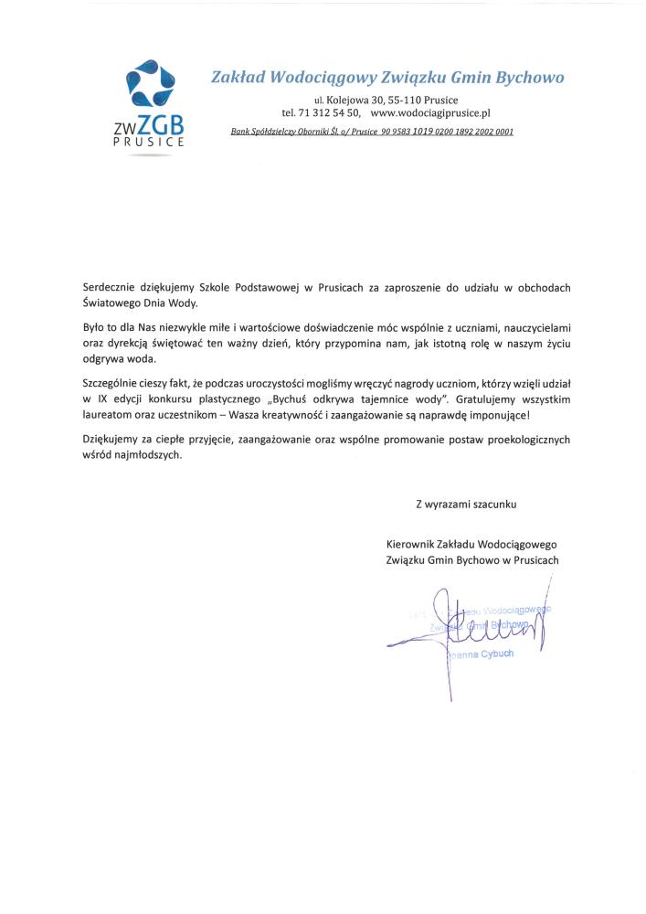 Dziękujemy Szkole Podstawowej w Prusicach za zaproszenie na obchody Światowego Dnia Wody.